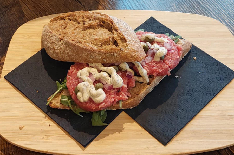 Ossenworst, rucola, kappertjes, rode ui en truffelmayo